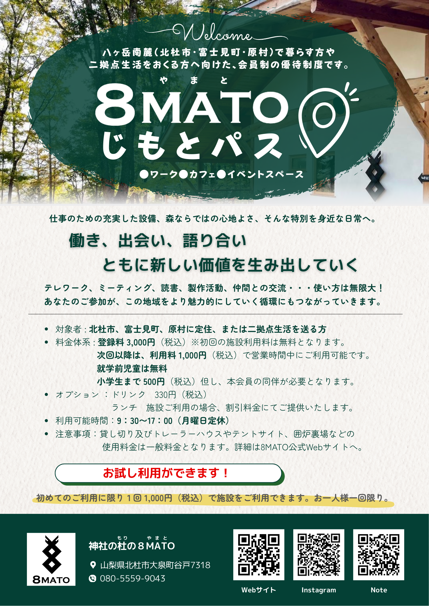地元にお住まいの皆さんに、気楽に使って頂きたいと、こんなパスを作りました。ぜひ、お気軽にお使いください。そろそろ、森に浮かぶテラスも気持ちいい季節になりました。